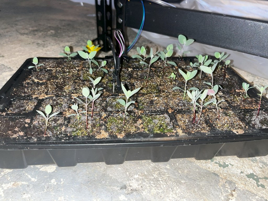 Native to Australia, it’s generally more difficult to grow eucalyptus in colder climates. It also has an extremely long maturity timeline. According to my research (+ seed packet) Eucalyptus takes approximately 200 days to mature fully. Therefore, in order to maximize its flower potential I figured out that I needed to start my eucalyptus, for hardiness zone 6B, mid-February. (Roughly 10-12 weeks prior to the last frost for the year). After completing my typical research+review of the flower, I purchased one packet of silver dollar seeds from johnnyseeds.com. I anticipated planting roughly 5 plants in my backyard garden and maybe giving a few to family/friends. However, since this was my first time attempting to grow eucalyptus and it seemed a little more temperamental then other seeds, I decided to utilize the entire seed packet I purchased and planted approximately 50 seeds on February 18th. (See my post on my seed starting process if you’re interested in how I prep my soil&what tools I use at the start of germination). With the environment outlined below, the eucalyptus produced ~35 sprouts within 4 days.