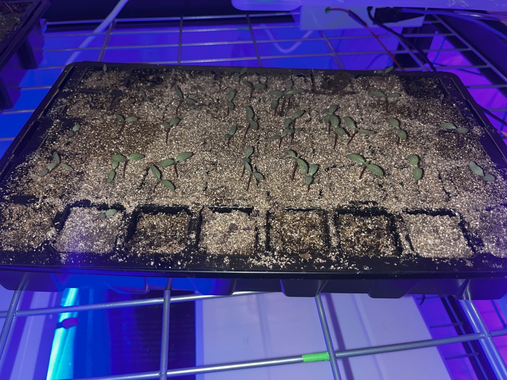 - Grow lights were hung approximately 12″ from the top of the soil. We kept our lights on a 5 AM – 10 PM schedule daily. If you have grow lights with multiple color options, like me, I would recommend keeping the lights on the blue setting to promote root growth.