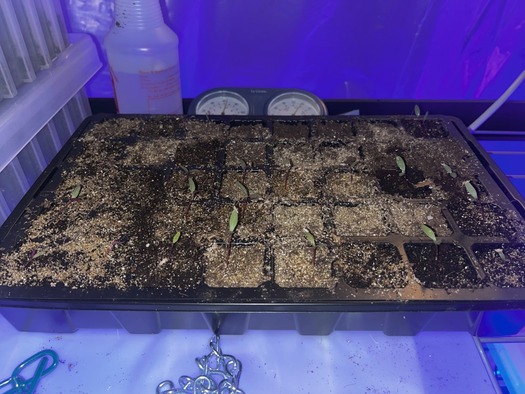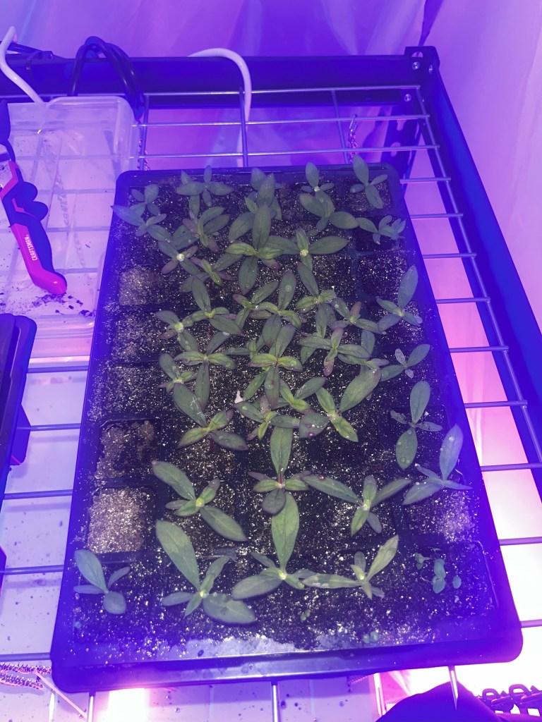 After my typical research+review on gomphrena, I purchased both Qis Cream and Qis pink varieties from johnny’s seeds. Gomphrena can be extremely temperamental during germination, I was warned to expect a roughly 25% success rate with my seeds. Therefore, I planted all 50 seeds of both varieties in their own seed tray on 3/19/2024.
