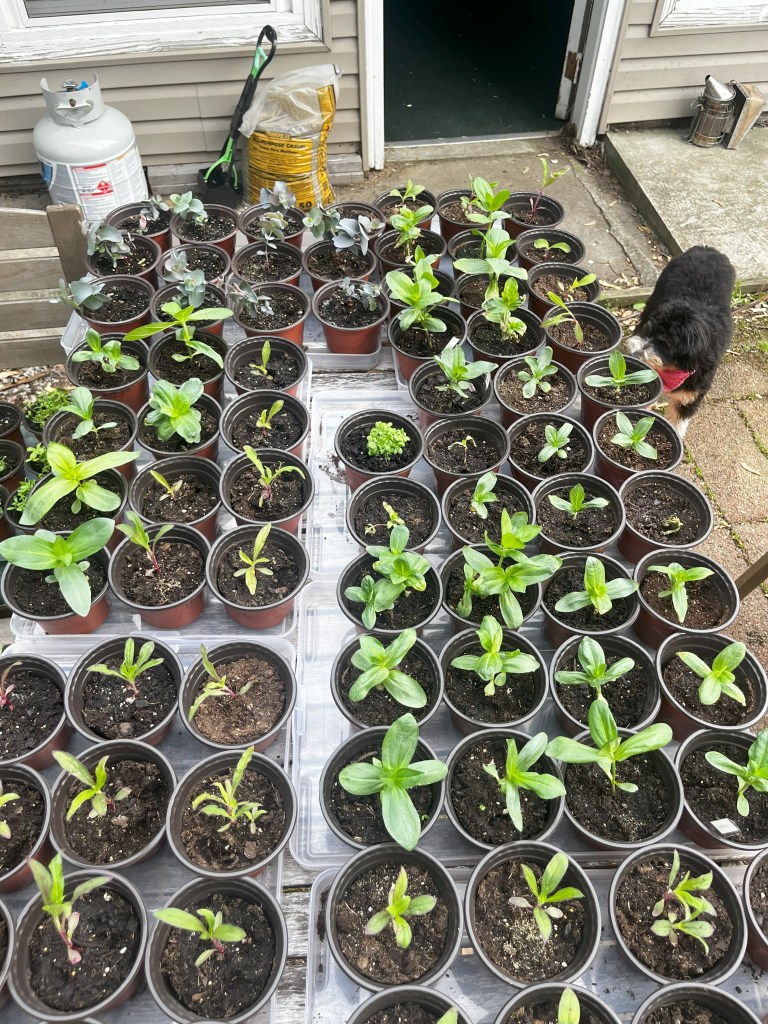 At this stage, we transplanted the gomphrena into 4″ diameter pots to give them a little more room to grow!