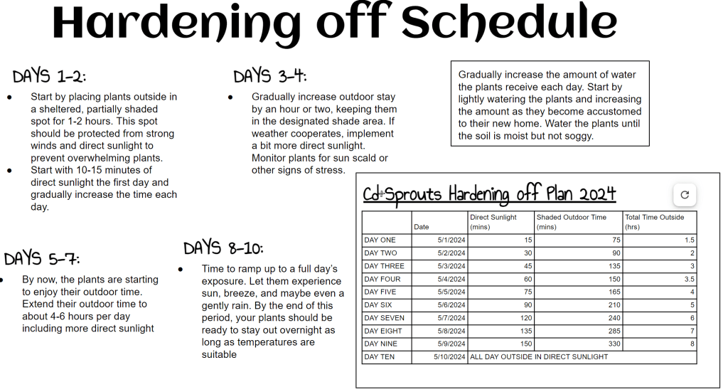 A big takeaway from my research into the hardening off process is that it’s important to vary both direct and indirect light quantities. Start hardening off by allowing your plants to see about 15 minutes of direct sunlight and 75 minutes of indirect sunlight. Gradually increase both direct and indirect sunlight times over 7-10 days before planting!