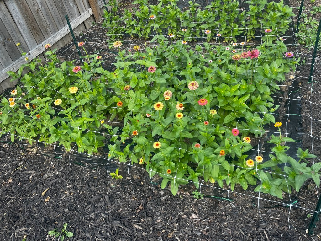 The Zinnia’s started the month going strong, growing about 12″ additional inches since being planted in May. We saw our first small blooms (above) mid-June (~6/16 ish). They really started to produce after these first few stems popped up. By late June the flowers were producing at~30%-50% capacity (below).